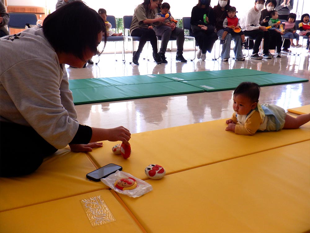 つどい交流の中で、初めて「はいはいよちよちレース」を開催しました。ちいさな子どもたちのかわいい姿に、見守っていたおじいちゃん・おばあちゃんも思わずニコニコ(*^^*)「がんばれ、がんばれ~」とやさしい声援がたくさんとんでいました。
