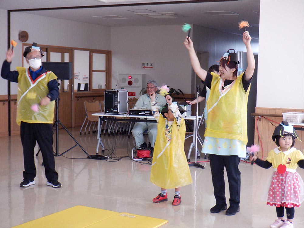センターを利用されているおじいちゃん・おばあちゃんたちもたくさん参加してくださいました。秋のやわらかい日差しが室内にふんわり差し込み、気持ちのよい雰囲気の中で交流することができました。