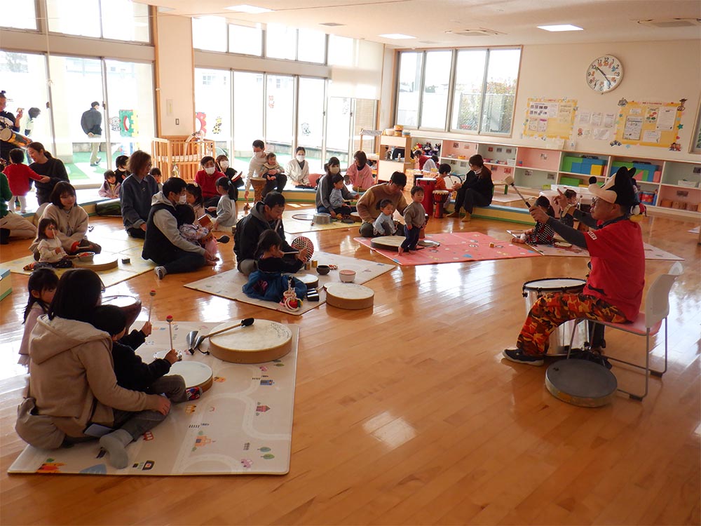 おおきなたいこ、ちいさなたいこ。いろいろなたいこが広場に大集合!みんなでリズム遊びを楽しみました♪