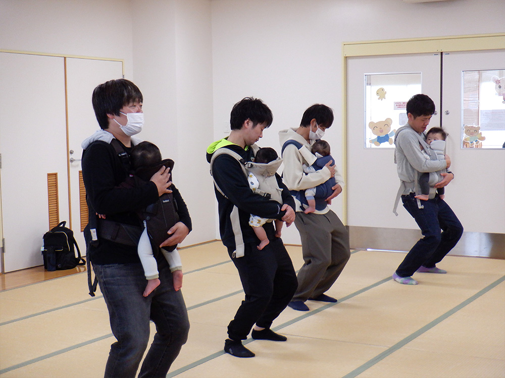 最後はこどもを抱っこした状態で、音楽に合わせて体を動かしました。しっかりと体がくっついていることで、こどもたちはもちろん、パパたちにも心地いいひとときになりました☆